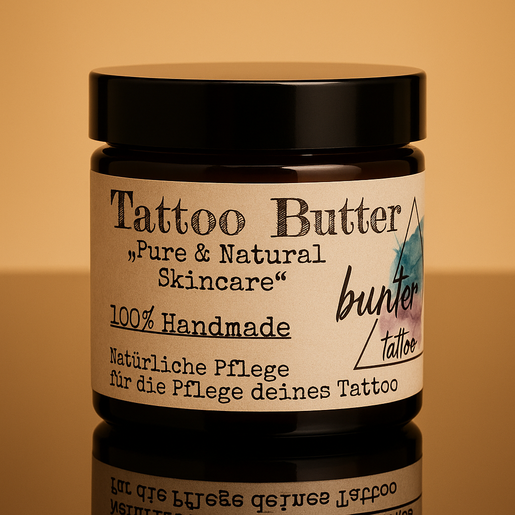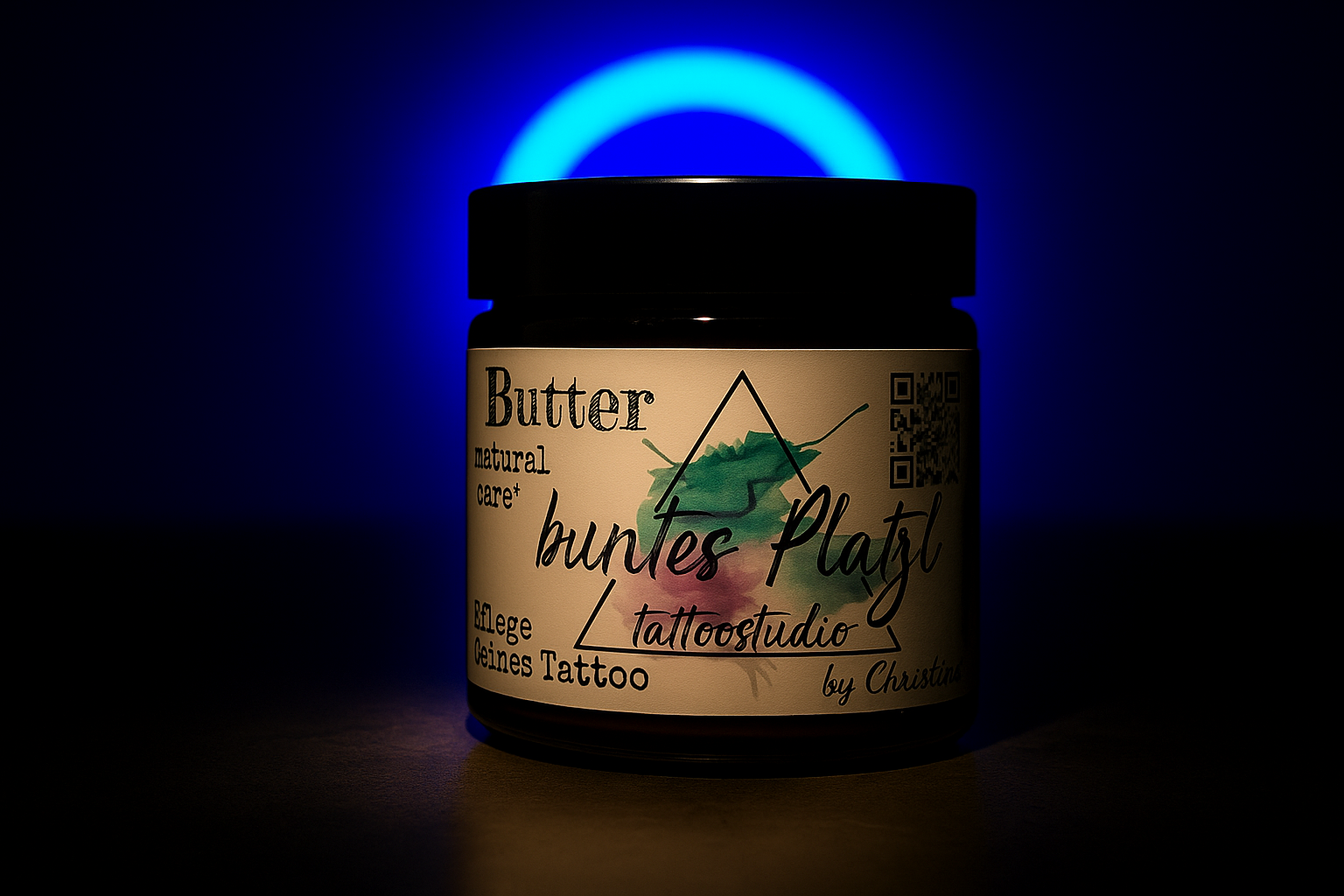 Unsere Tattoo Butter gibt’s zur Markteinführung jetzt für nur 10 € statt 13 €! Handgemachte Tattoo Butter mit Kokosöl, Sheabutter, Mangobutter, Lavendel und Aloe Vera. 100% natürlich, pflegend und regenerierend – für strahlend schöne Haut und perfekt gepflegte Tattoos.